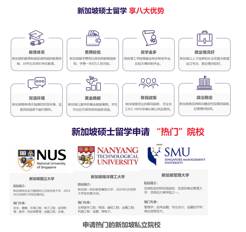 • 院校与项目解读:详细介绍新加坡主要院校(如新加坡国立大学、南洋理工大学、新加坡管理大学等)的研究生项目特色、课程设置与学术优势。